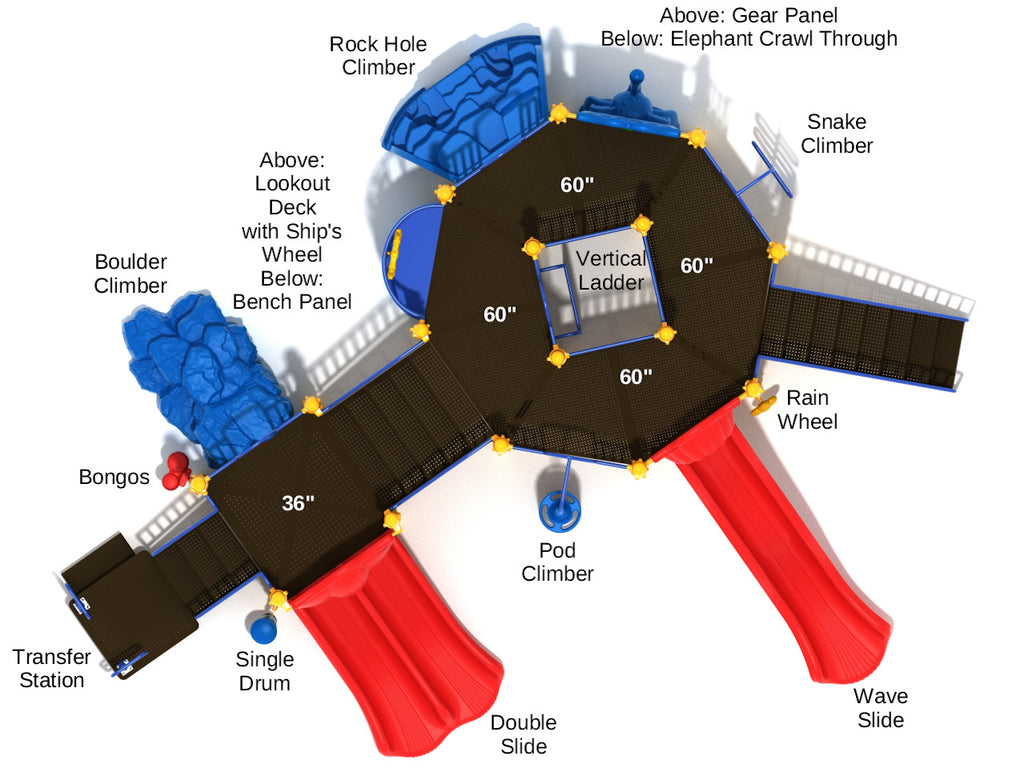 The spacious San Luis outdoor play equipment features an octagonal platform where multiple features extend out from including a Vertical Ladder, a Snake Climber and a Pod Climber that promote physical activity. For kids who need more excitement and stimulation then there’s the Rock Hole Climber and Boulder Climber which give young minds a real taste of what it’s like to go mountaineering. These features have no specific grip holds to help kids climb up, but instead their natural molded form encourages children to make their way up using their own physical ability. A wobbly and bumpy Wave Slide and a speedy Double Slide let kids reach the playground quickly where they’ll discover a range of extra features. There’s a fun Elephant Crawl Through below a Gear Panel and a 360-degree Lookout Deck with Ship’s Wheel so multiple children can pretend they’re sailing the seas looking for a treasure island or pirates. The addition of a Single Drum, Bongos and a Rain Wheel bring a musical element to the structure.