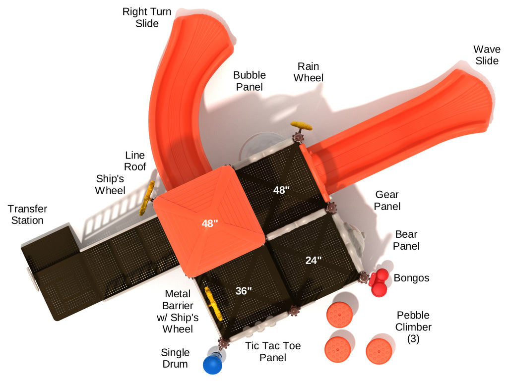 Set underneath a large Line Roof which protects from UV rays as well as rain, the set features a large Wave Slide as well as a Right Turn Slide for children to enjoy over and over again. The Transfer Station allows kids with different abilities to access the structure, and the Pebble Climber boosts confidence and coordination as they wobble their way to the platforms. Santa Cruz features a variety of interactive panels for children of all ages. A Gear Panel and Tic Tac Toe Panel bring strategic fun to test their brain power, while the Bubble Panel and Bear Panel inspire imagination. Kids will love to get musical with the Bongos attached to a lower pole and the Single Drum and Rain Wheel add to the potential for music-making fun. There are two Ship’s Wheels on the structure, one on the upper deck and one at ground level, which is perfect for a Captain and their Lieutenant Commander to steer the sea-faring fun in a new direction.