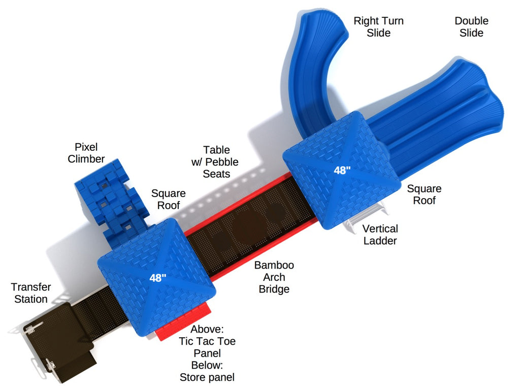 This Scranton Play System offers a range of fun-packed features that make it an adventure hub for kids. It has a thoughtfully designed structure that ensures that the little explorers have the best time at your playground. The Bamboo Arch Bridge is the star of the show. It connects two towers with a fenced-in bridge, and those with a knack for quests can run across it. When tired, the kids can catch a breath under the shaded Table with Pebble Seats beneath the bridge. Both the towers are 4 ft tall and feature a square roof, just like the castles, for an added magical element. At its base, one of the towers has a store panel where kids can act like they’re in a marketplace. The Double Slide and Pixel Climber keep the excitement alive by offering a thrilling way back to the ground. With its creative features and secure design, the Scranton Play System is truly a must-have for all commercial playgrounds!