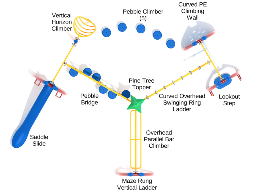 Imagine having a forest-themed obstacle course in your local park or school grounds for children to have the time of their lives. A Pebble Climber and Pebble Bridge immediately invite the attention of young kids who want to pretend they’re hopping across a river below or a lava flow. A central Pine Tree Topper evokes the sense of being in a forest with treehouses, rope bridges, and swings to enjoy, and it can all be experienced on activities like the Curved Overhead Swinging Ring Ladder and Overhead Parallel Bar Climber that requires a different kind of manual dexterity to get across. The Lookout Step is the perfect starting point for any kind of obstacle course where children race around the Sears Bellows equipment including a Curved Climbing Wall and Maze Rung Vertical Ladder. Children can see the entire playground from the top of the Vertical Horizon Climber and the Saddle Slide will be a real test of balance and coordination.