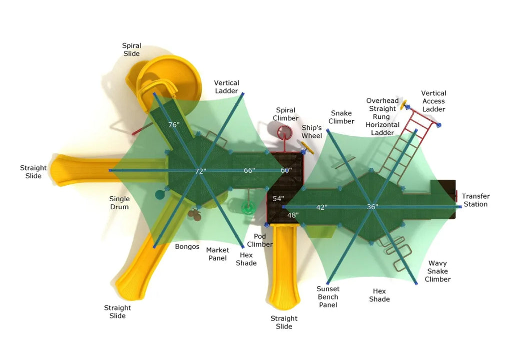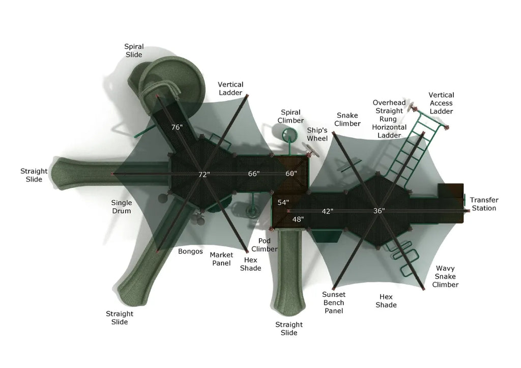 Welcome to Shady Sands—a playground where fun and comfort come together!Kids can start the excitement with one of four thrilling slides, including a Spiral Slide and three Straight Slides perfect for racing down. For those who love climbing adventures, the Snake Climber, Spiral Climber, Pod Climber, and Overhead Ladder offer plenty to explore.For little ones or those who prefer to stay grounded, Shady Sands has plenty to offer. The Ship’s Wheel, Rain Wheel, and musical Bongos add creative flair to every play session, while the Market Panel inspires imaginative role-play.The real standout? Shady Sands lives up to its name with two large Hex Shades. These provide cool, refreshing shade, letting kids and caregivers enjoy the playground even on sunny days, making it a perfect choice if you live in an area with a dry climate.Bring the joy of Shady Sands to your community today!