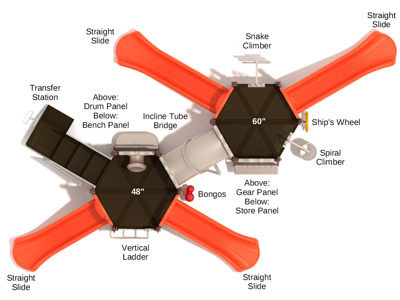 Two hexagonal platforms for the basis for a wealth of play options children can experience. Not only are there four long Straight Slides extending from the upper deck ready for racing down, but there’s an Incline Tube Bridge connecting the platforms to let children cross in a novel way. The Sunnyvale benefits from a Transfer Station and multiple other ways to climb up too, from a Spiral Climber and Vertical Ladder to test agility and promote coordination to a Snake Climber ideal for acrobatic children to let their joints experience a range of motion. It’s so easy for children to lose themselves in imagination on the Sunnyvale structure whether they’re chasing each other in a game of jail tag, sailing on an adventure with the Ship’s Wheel, or climbing around an elevated treehouse. A Drum Panel and Bongos add music to the structure and children will get a kick out of bashing them to create sound. The Gear Panel lets children experiment with movement and the Store Panel fosters hours of creative play. When they need to take a rest from all the fun they can even take a load off on the Bench Panel and contemplate what they’re going to play on next.