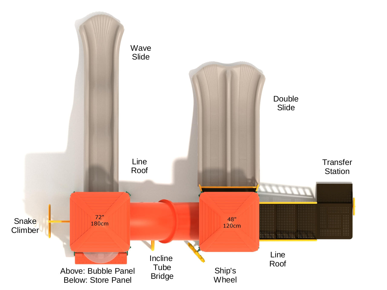 Telluride can easily double the foot traffic of your playground or park because it comes with many fun activities. Firstly, it has two entry points, the simple Transfer Station and a little challenging Snake Climber. Younger kids can climb up the deck using the Transfer Station, while the brave ones can enjoy the climb of the Snake Climber. Also, there are 2 sides of the deck, and both are connected with the Incline Tube Bride. So, no matter which side kids climb from, they can easily get to the other side using this Tube Bridge. Also, there are 3 slides to maximize the fun. One is a double slide (2 connected slides) that can accommodate 2 kids at once, and the other is a Wave Slide, which provides a bumpy yet safe sliding experience. Besides these fun slides, there are other activities like a Store Panel for kids to play pretend games, a Bubble Panel to enjoy the outside view, and a Ship's Wheel to keep kids active and engaged.
