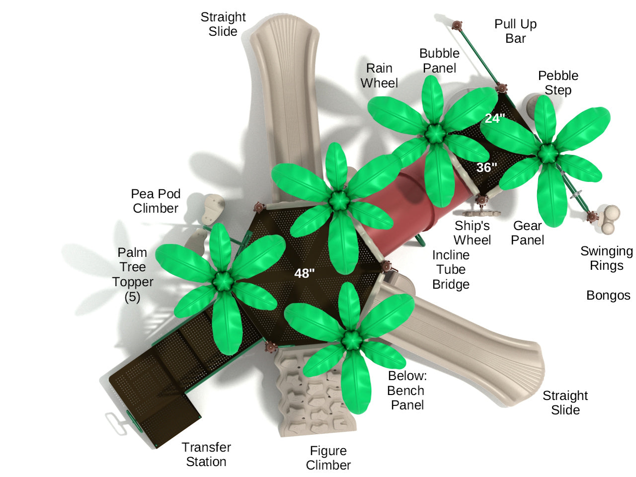 The Tempe play equipment is a feast for the eyes as it sits like a tropical oasis in the middle of the playground thanks to the five gorgeous Palm Tree Toppers which provide sufficient shade from the hot sun. The hexagon platform is a central feature from which other exciting activities extend including two Straight Slides which emerge in opposite directions for fun downward travel. The platform can be accessed either by scaling the Pea Pod Climber which extends up like a growing plant with leaves on each side, or by scrambling diligently up the rocky bank of the Figure Climber which gives kids the feeling of hiking in the mountains. There’s a Bench Panel underneath the slide so children can hear others whizzing past above them, a Rain Wheel to bring the sound of splashing water to this rainforest setting, plus a Gear Panel and Ship’s Wheel to inspire the imagination. On one end of the Tempe structure there is a lot going on. From a Pebble Step to climb up and Bubble Panel to look out of, to two Swinging Rings for gymnastic stunts and a Pull Up Bar to build upper body flexibility and strength.