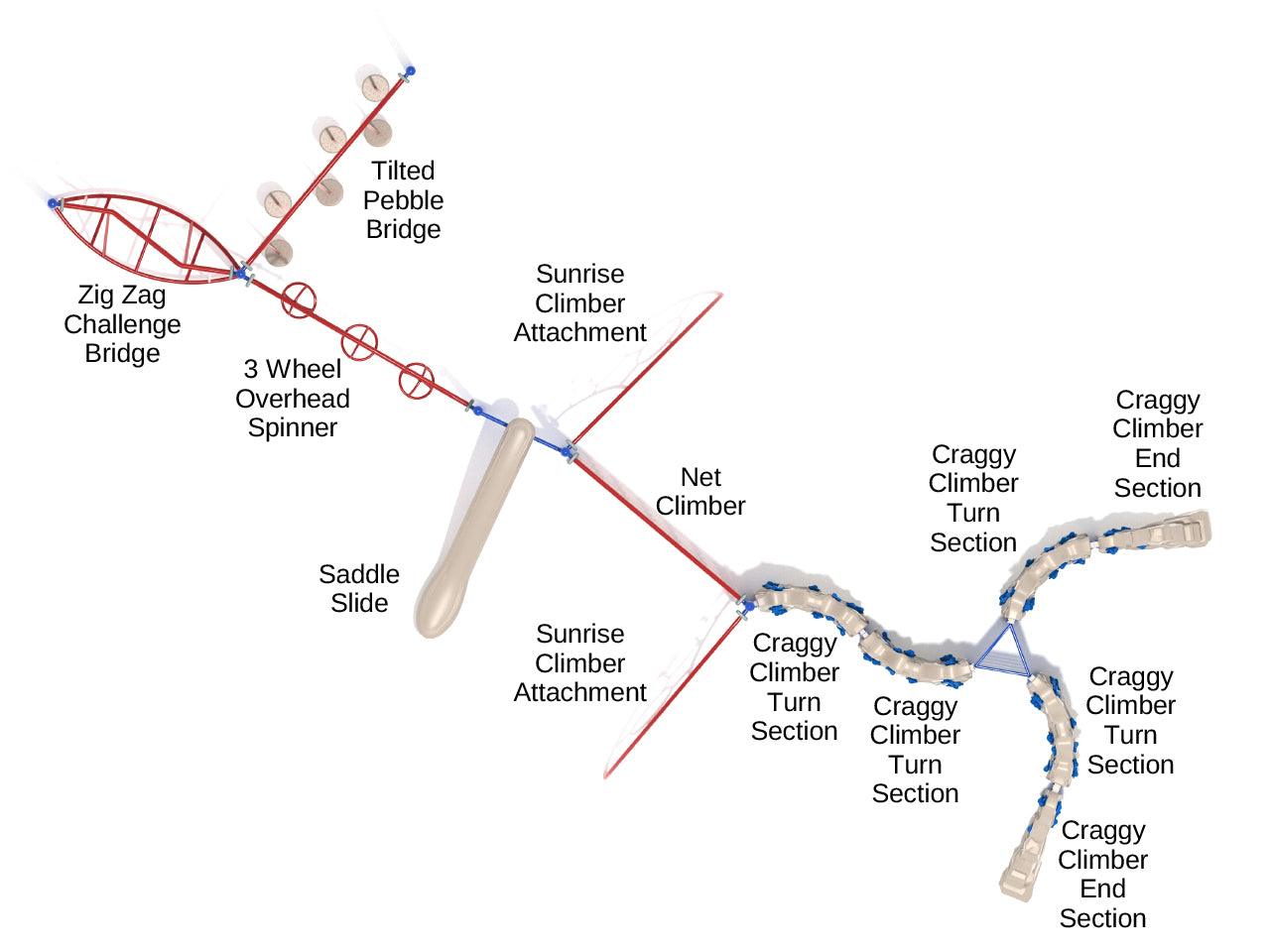 A huge draw to the Thunder Basin playground equipment are the multiple Craggy Climber Turn Sections and Craggy Climber End Sections which work together to create an entire mountain range in your playground. With a Craggy Tri Connect at the center kids can work their way around the 12 rock climbing wall faces discovering holes to place their feet and peep through and lots of combinations of hand holds for a diverse climbing experience. Two Sunrise Climber Attachments and a Net Climber offer a different kind of climbing style as they navigate the bars and ropes, going over the top or underneath. One end is perfectly designed to start an obstacle race with both a Tilted Pebble Bridge and a Zig Zag Challenge Bridge leading to a 3 Wheel Overhead Spinner which will test their upper body strength and a Saddle Slide to rocket down.