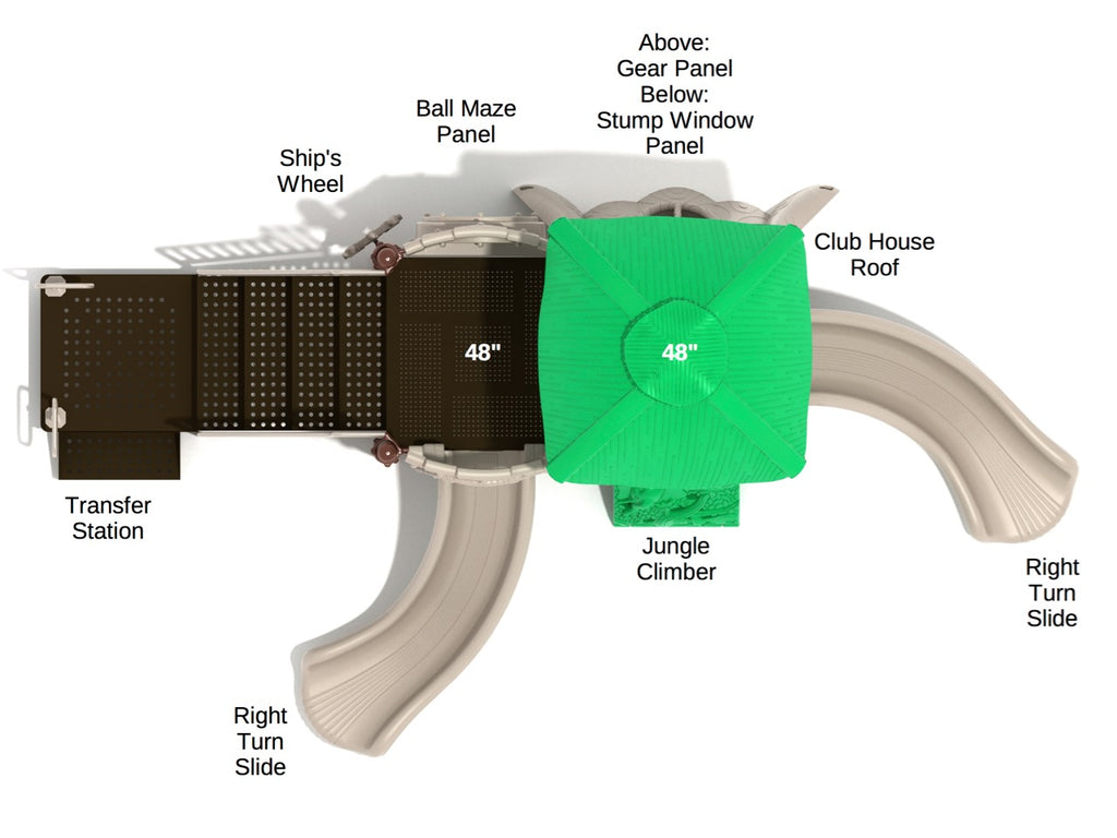 Get kids excited for playtime with the Tilly Tiger outdoor playset. Two Right Turn slides ensure there’s never a line of restless kids wanting to slide down, and the twist in the slide will prove popular as they change direction halfway down. The Club House Roof keeps rain off in winter and gives protection from the sun in summer, so kids can play happily on the Gear Panel all year round. On the lower level, there’s an interactive Ball Maze Panel that requires problem-solving abilities and fine motor skills to twist the ball into place, and a Stump Window Panel inspires imaginations as they look out of their woodland home into the jungle beyond. The Jungle Climber is an excellent way to transport children’s minds to a tropical location as it features a tropical scene with 3D animals poking out from the undergrowth. Kids can place their feet and hands on the relief to make their way to the upper platform. A Ship’s Wheel lets kids pretend they are pirates or on a jungle river cruise.