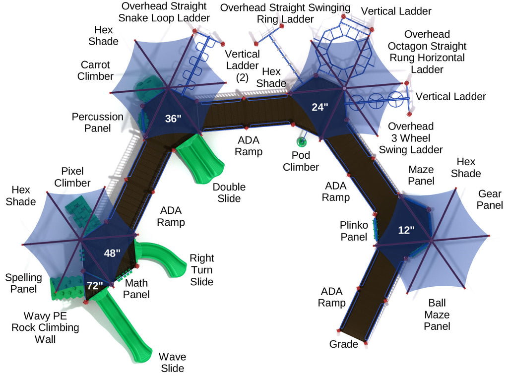 Spread over four hexagonal platforms, each with an enormous Hex Shade to provide shelter from wind, sun and rain, the Turkey Trail is ADA compliant thanks to the four connected ADA Ramps suitable for wheelchairs. Metal railings around the side also support less abled children right from the start to the multiple slides they’ll encounter on the way round including a Double Slide, Right Turn Slide and a wobbly and bumpy Wave Slide. Less abled children are able to experience all the fun of the equipment thanks to the many interactive panels including a Maze Panel, Plinko Panel and musical Percussion Panel. For kids that want to build their upper body strength they can choose from an Overhead Straight Snake Loop Ladder, Overhead Straight Swinging Ring Ladder and a challenging Overhead 3 Wheel Swing Ladder that twists and spins when grabbed. There’s even a large Overhead Octagon Straight Rung Horizontal Ladder so kids can see if they’ll make it a full 360 degrees. A Pod Climber, Carrot Climber, Pixel Climber and Wavy Rock Climbing Wall offer four additional ways to access the platforms.