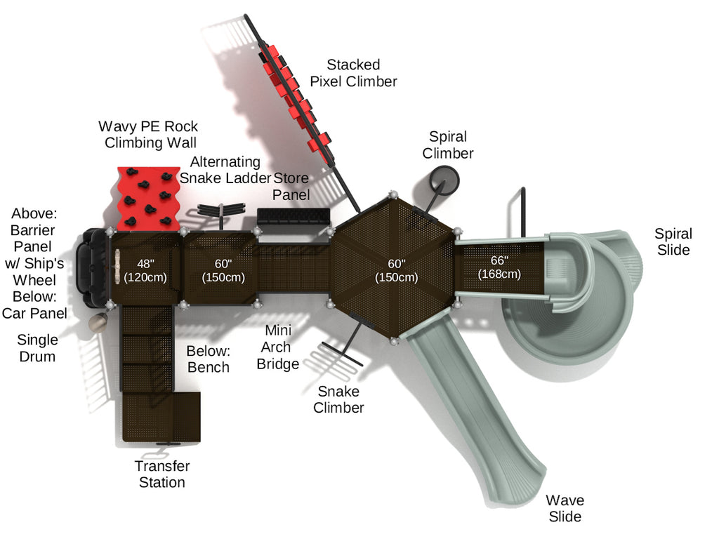 Standing tall above the playground like a futuristic moonbase, the first thing kids will notice is the huge Stacked Pixel Climber. Offering an alternative to a traditional climbing wall, this structure has lots of 3D cubes and square holes for children to put their hands and feet on. There’s also a Wavy Rock Climbing Wall for younger children to practice on as well as an Alternating Snake Ladder and a Snake Climber to reach the upper deck. Once they’ve climbed up using the Spiral Climber they can take a dizzying ride down again on the Spiral Slide or if they’ve had enough twisting fun they can opt for the Wave Slide instead. Play panels complete the structure and children can choose to roleplay on the Store Panel, drive the Car Panel with their friends, or play captain on the Barrier Panel with Ship’s Wheel. A Mini Arch Bridge adds an element of fun and a Bench Panel is perfect for encouraging social interaction.