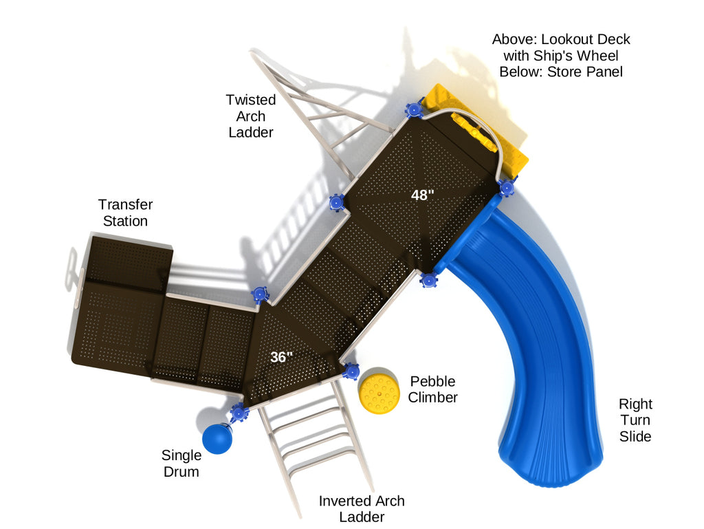 Can you name a more fun way to keep children happy and occupied other than challenging them to climb a 4-ft high summit? Yes, that Valparaiso for you! Featuring three exciting pathways to the top, this playground set is ideal for those little adventurers. The best part? It’s super inclusive! The Transfer Station Stairs allow an easy way for young or disabled kids to reach the top. As for those who seek challenges, the 3-ft Inverted Arch Ladder is just what they need. Kids can even skip the arch altogether and take a more adventurous route – the Pebble Climber! Also, the bravest ones can take the shortest route to the top via the Twisted Arch Ladder and take command of the Ship’s Wheel. But the fun doesn’t stop after they reach the top. They can always make their journey thrilling back to the ground level with the Right Turn Slide. The Valparaiso Play System also offers a drum that kids can play when they feel tired from all the climbing and sliding!