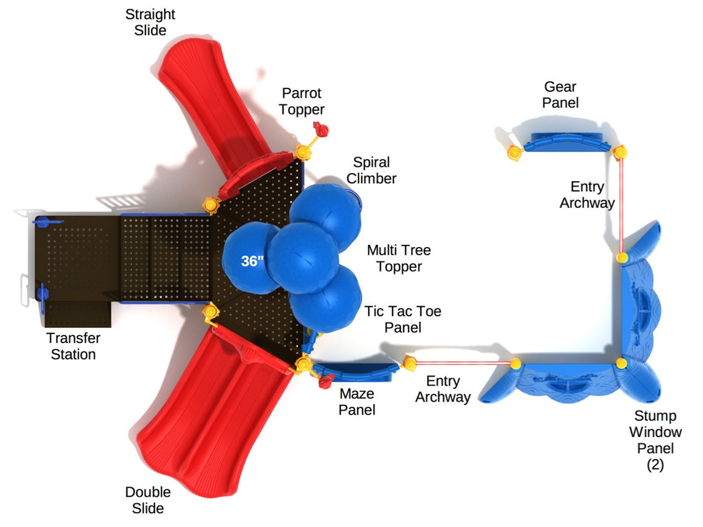 The Wandering Wolf is made up of two sections. A main play structure and an area for younger children all on ground level. The Transfer Station offers a convenient way to access the upper platform and sit under the Multi Tree Topper, but if they want to challenge themselves then they can work their way up the Spiral Climber. A Parrot Topper watches over the fun as kids fly down the Straight Slide, or grab a friend and head down the Double Slide together. On the lower level, 2 Stump Window Panels are attached in a corner formation to create the impression of a house built into the side of a tree. The double Entry Archways make the doors, and there’s lots of fun to be had with the panels. The Gear Panel could become the way kids gain access to unlock the door of the house, and the Maze Panel has the potential to become a hidden treasure map. When kids want to challenge their friends, the Tic Tac Toe Panel comes in handy for developing basic gameplay intuition.