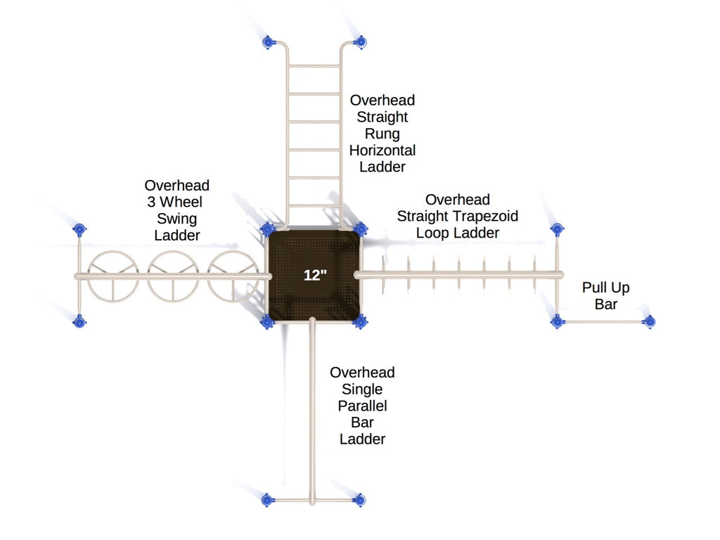 Gymnastic abilities and upper body strength will be tested again and again on the White Plains play set. Children can start on the central platform and choose from four different overhead bar experiences. They can swing their way to the end and drop or double the challenge and turn their body around and shimmy back to the platform. The Overhead Straight Rung Horizontal Ladder and Overhead Single Parallel Bar Ladder are two of the easiest ones to master but will still challenge young monkeys as they must coordinate hand movements while keeping their body balanced to succeed. The Overhead Straight Trapezoid Loop Ladder steps up the difficulty as the bars are angled and to grip them children must have the confidence to let go and reach for the next bar. There’s a Pull Up Bar attached at the end to practice on too. The real challenge comes from the Overhead 3 Wheel Swing Ladder where too much body movement makes the child swing around dizzily until they can grab the circular bar in front.