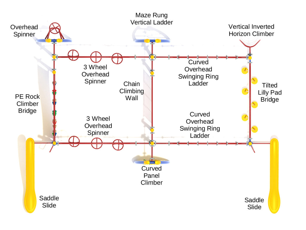 The Whitney is an expansive play set featuring multiple overhead activities designed to give kids the confidence and physical ability to tackle anything they put their mind to. This recreational apparatus can support multiple children playing at the same time but it is also designed so that two or more children can use it as a competition obstacle course to race each other. Each route is slightly different but it incorporates a Curved Overhead Swinging Ring Ladder which is harder than it looks, then up and over the Chain Climbing Wall, across the 3 Wheel Overhead Spinner which is tricky to master and then finishing by either using the Rock Climber Bridge or Tilted Lily Pad Bridge before slipping down the Saddle Slide to the finish line. The Maze Rung Vertical Ladder and Vertical Inverted Horizon Climber are both excellent starting points, and the Overhead Spinner is just there for dizzying amounts of fun.
