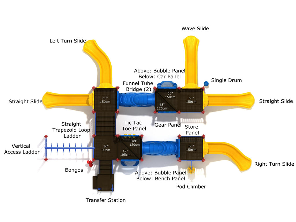 Willamette offers 5 slides for young adventurers, catering to 60+ kids of age up to 12. It has 2 Funnel Tube Bridges connecting different levels that allow for imaginative exploration. So, kids can create treasure hunts by hiding small clues around the playground. Their pals can search for them by navigating the Bridge and Pod Climbers. Finding hidden surprises will strengthen their problem-solving skills. Willamette’s 5 slides will provide quick escape routes when kids play cops and robbers. Or, they may pretend this whole structure is a great castle, and they’re knights exploring its dungeons. The Store and Bench Panels can be their secret meeting points or command centers. At Willamette’s 2 Bubble Panels, these knights can talk about forlorn days and socialize with fellow treasure seekers. They may organize a band and create new rhythms with the Single Drum & Bongos. At the same time, the Straight Trapezoid Loop Ladder will prevent boredom during these lively music performances.