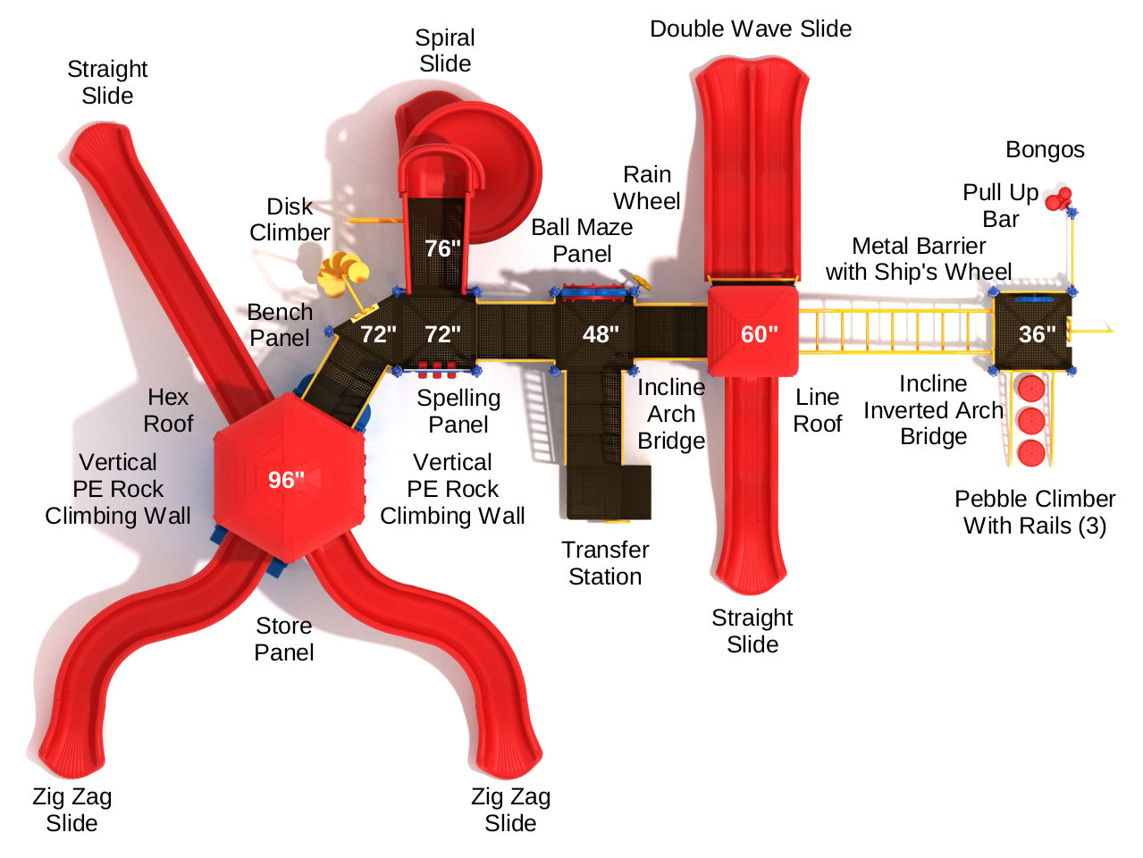 The Wood’s Cross adventure equipment for outdoor use is a large structure containing multiple slides for children to zoom down. Two Straight Slides are accompanied by two bendy Zig Zag Slides, a Double Wave Slide for competitive racing and a twisting Spiral Slide. This ensures that there’ll never be queues to use the slides and children will get a great amount of exercise climbing up the Disk Climber or one of the Vertical Rock Climbing Walls to get back to the top again. Added onto the end of the playset is a platform packed with features including a Pull Up bar to improve gymnastic ability, a Pebble Climber with Rails to jump on, and the Incline Inverted Arch Bridge is an inspiring way to get across to the main structure. Creativity and problem-solving can be found on the Spelling Panel for young learners and the Ball Maze Panel which will leave kids captivated. For kids who love to roleplay, there’s a Metal Barrier with a Ship’s Wheel to navigate the high seas on.